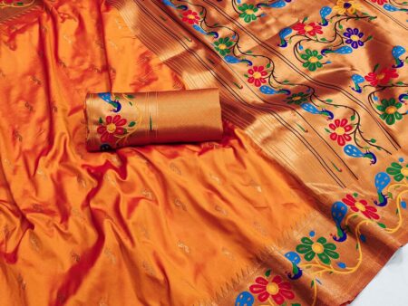 Adoring Orange Paithani Silk Saree With Ailurophile Blouse Piece