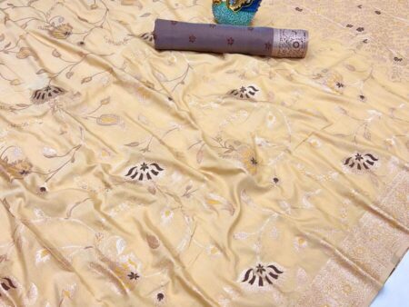 Adorable Beige Soft Banarasi Silk Saree With Ratatouille Blouse Piece