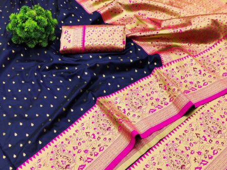 Adorable Navy Blue Soft Banarasi Silk Saree With Radiant Blouse Piece