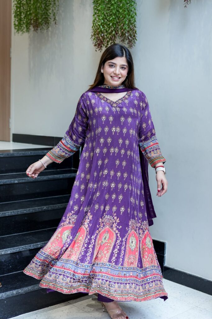 Kurti set crafted from premium Chinon fabric.