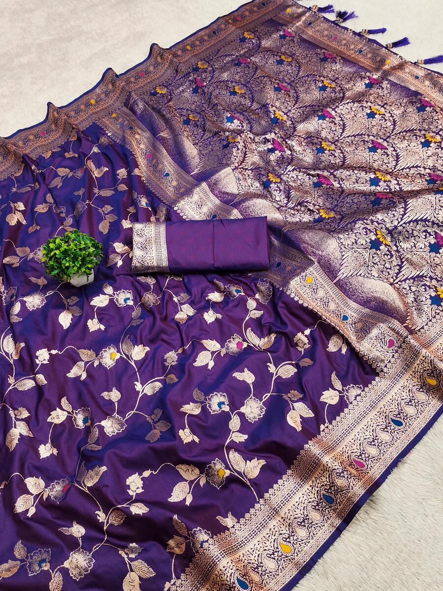 Artistic Royal Purple Pure Zari Weaving Banarasi Silk Saree With Impressive Blouse Piece