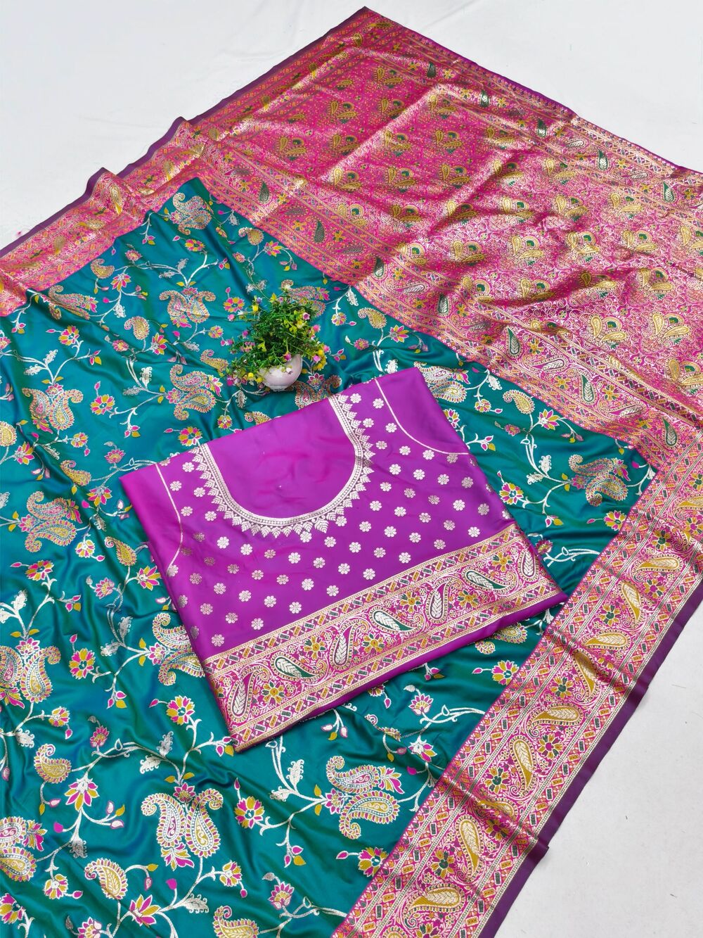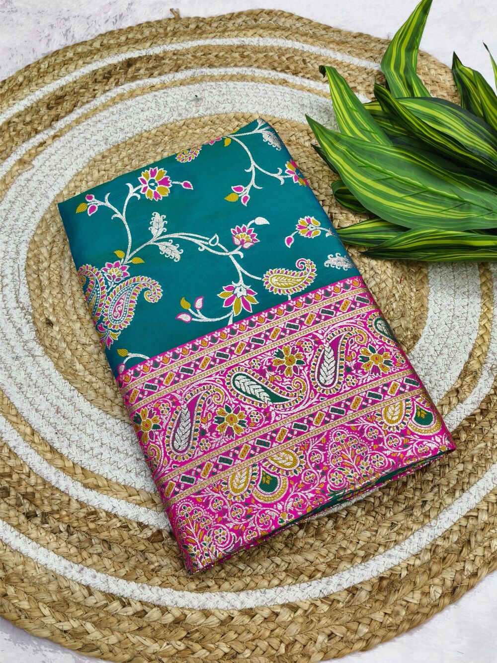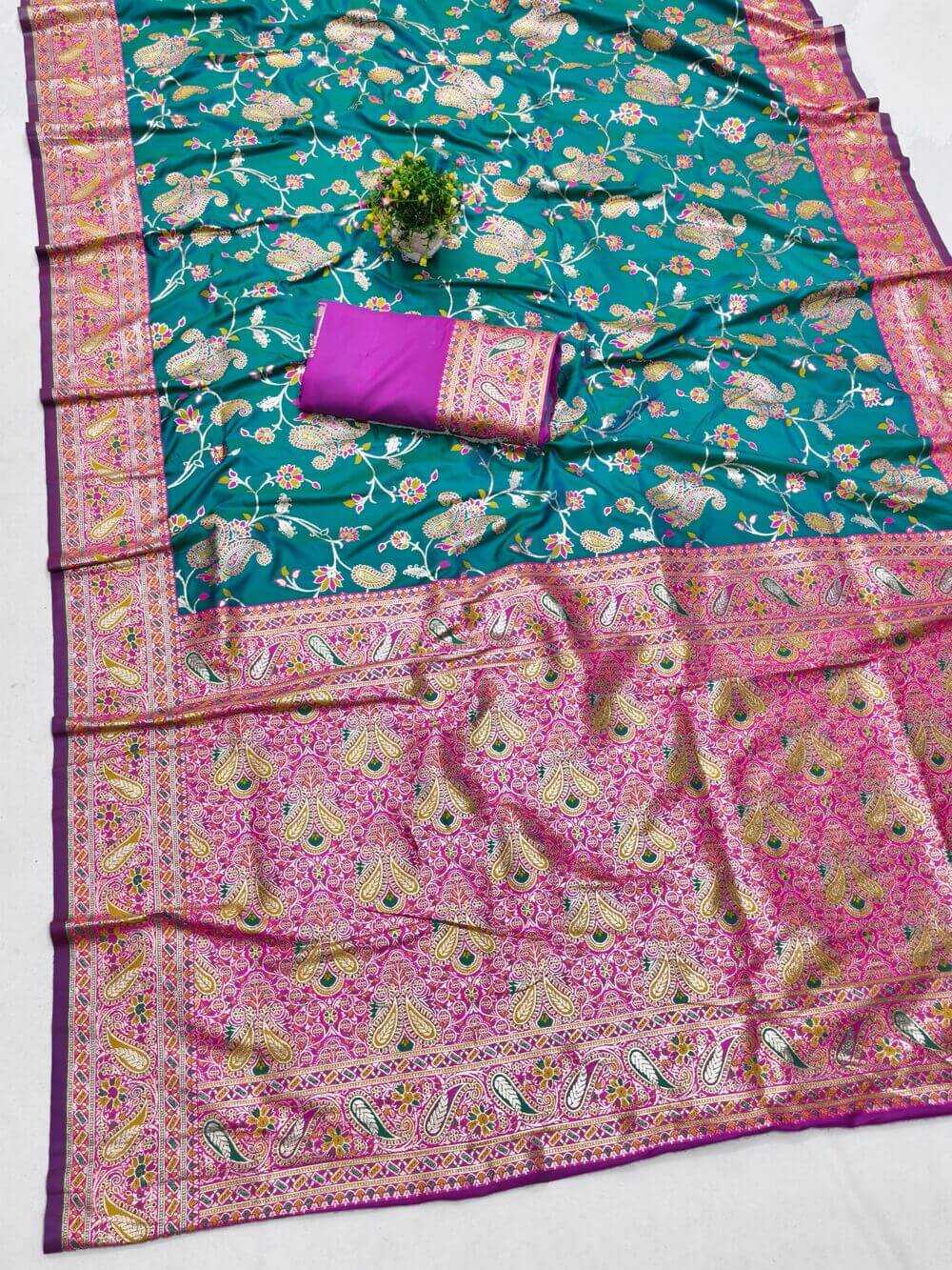 Assemblage Firozi Pure Zari Weaving Banarasi Silk Saree With Ravishing Blouse Piece
