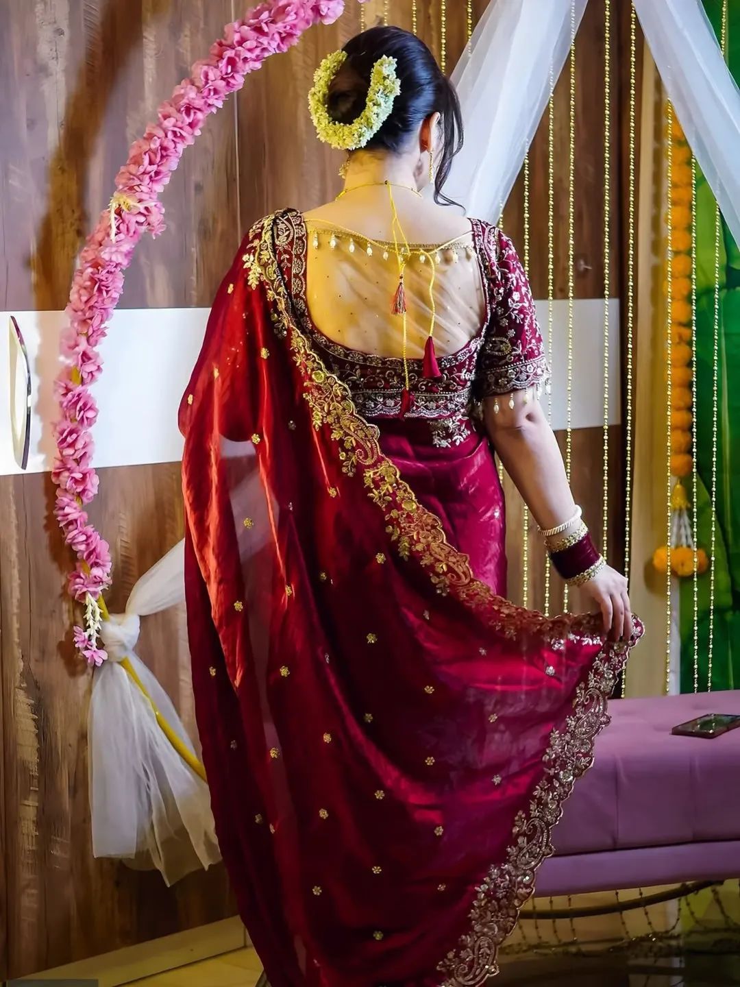 What makes this saree truly special is the attention to detail in every stitch. The matching embroidered blouse comes with delicate pearls work and is stitched up to XXL size (44 inches), ensuring a perfect fit for most body types. The solid craftsmanship reflects in the neat finishing and durable quality that will last for years to come.