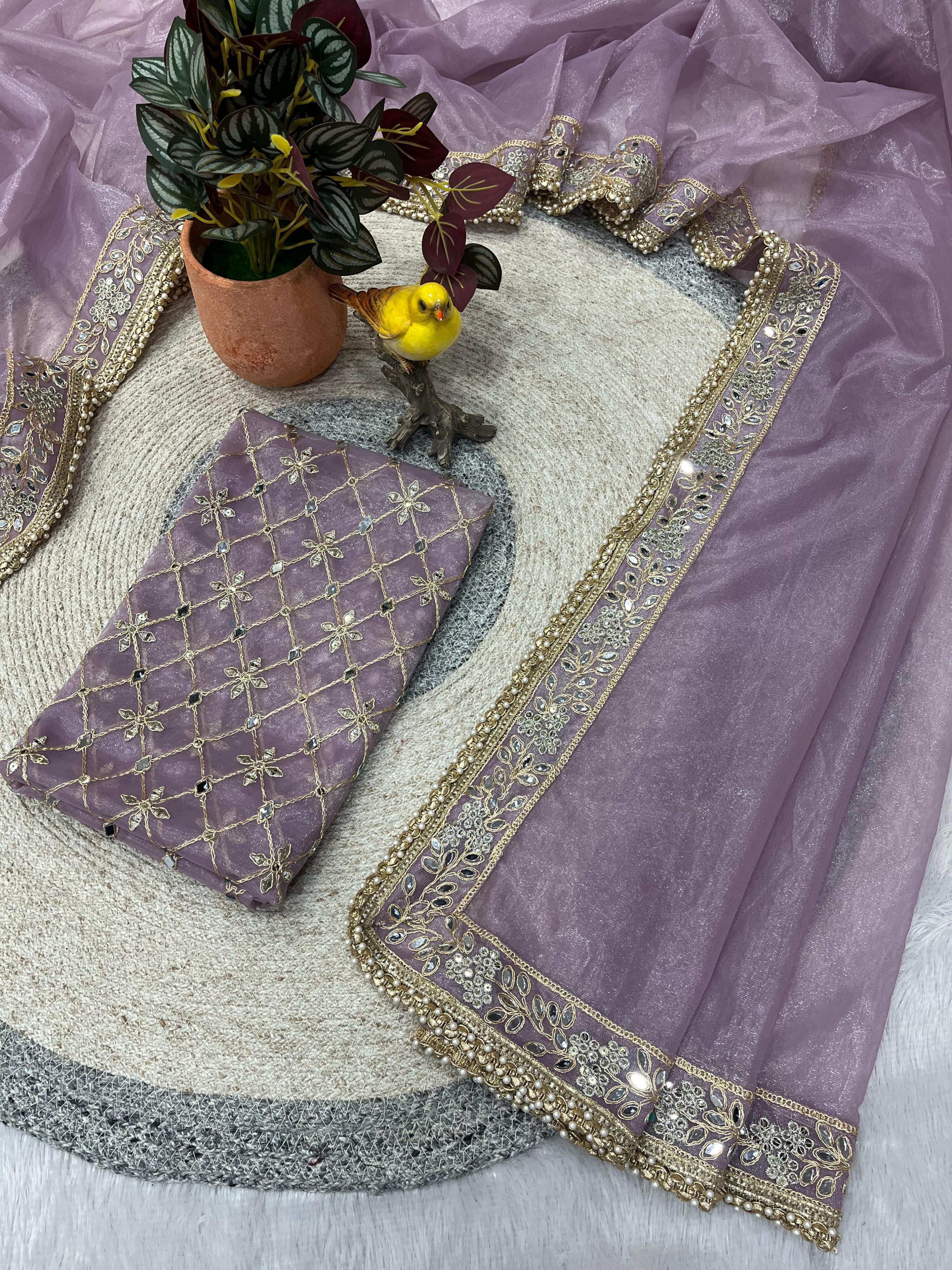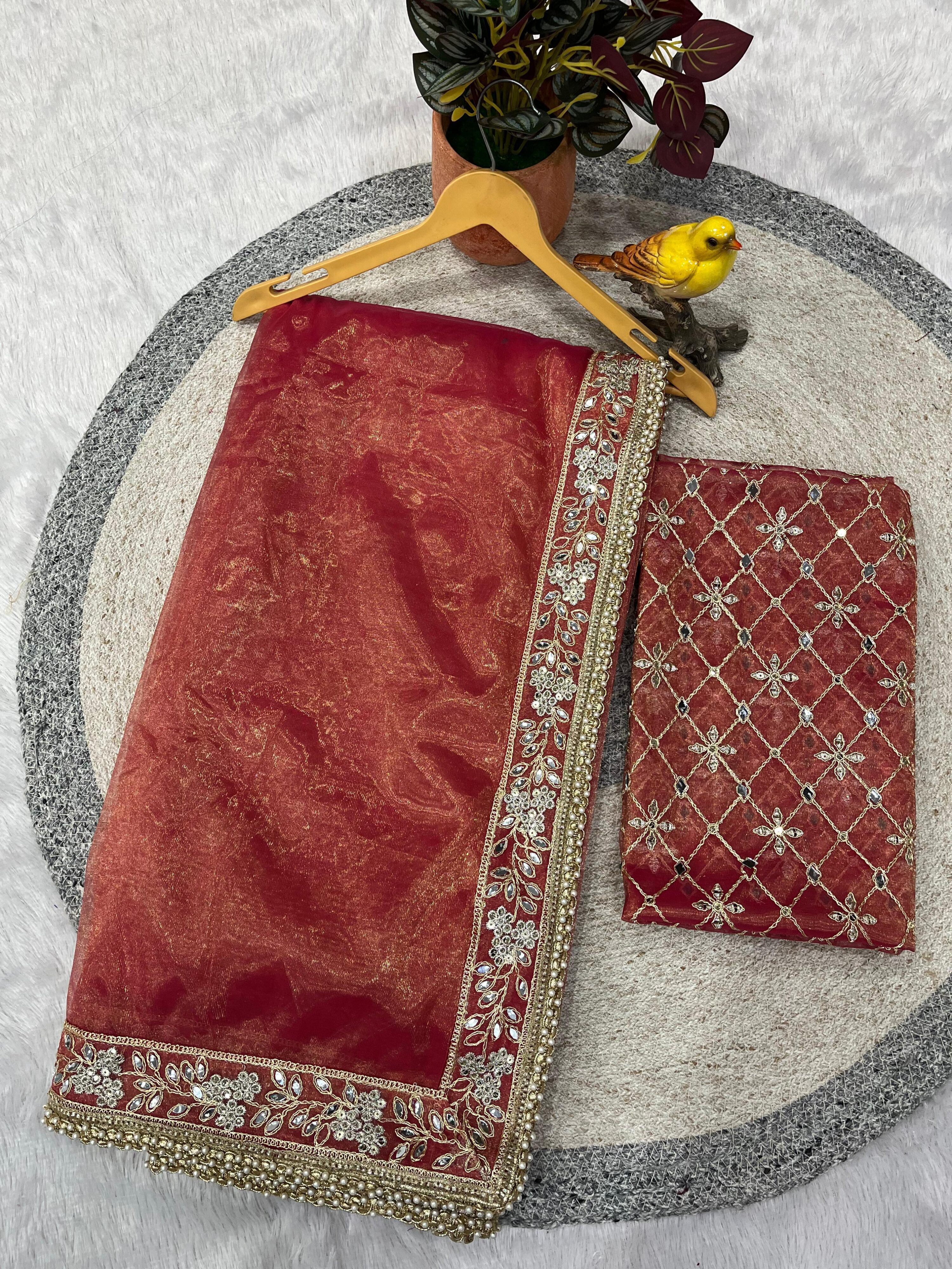 This saree is perfect for weddings, festive celebrations, and grand occasions where you want to make a lasting impression. The lightweight Silver Tissue Silk fabric drapes beautifully and feels comfortable for long hours. The mirror work catches light brilliantly, making you shine at any event. Pair it with traditional gold jewelry and a sleek bun for a classic look, or style it with contemporary accessories for a modern fusion appearance.