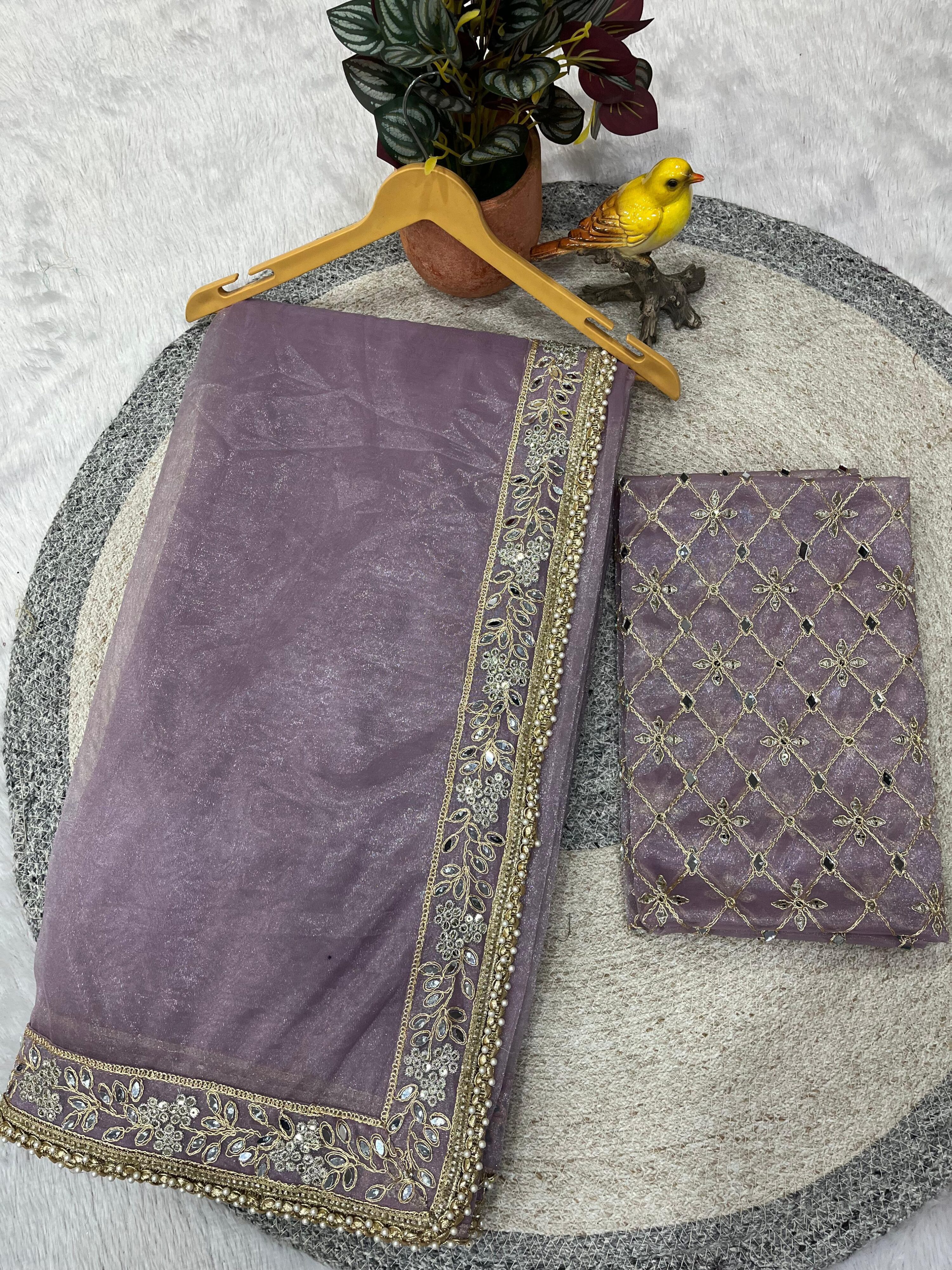 Wrap yourself in timeless elegance with this exquisite Designer Embroidery Saree featuring stunning mirror work. Crafted from luxurious Silver Tissue Silk, this saree showcases intricate embroidery work enhanced with sparkling sequence, traditional Zari dori work, and authentic mirror embellishments. The fancy lace border adorned with pearls adds a regal touch to this masterpiece.