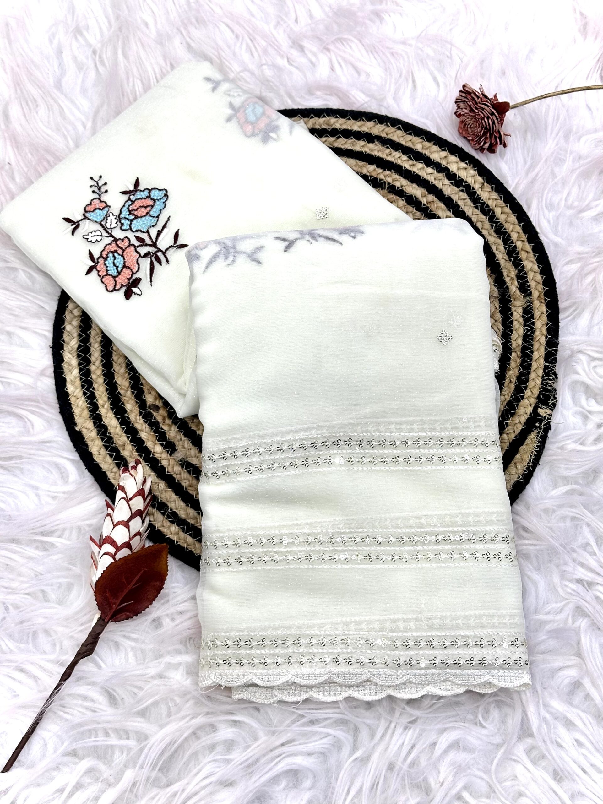 New fancy embroidery saree* Off white color simmer saree with full of e h j
