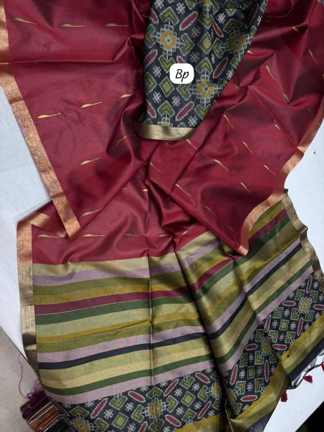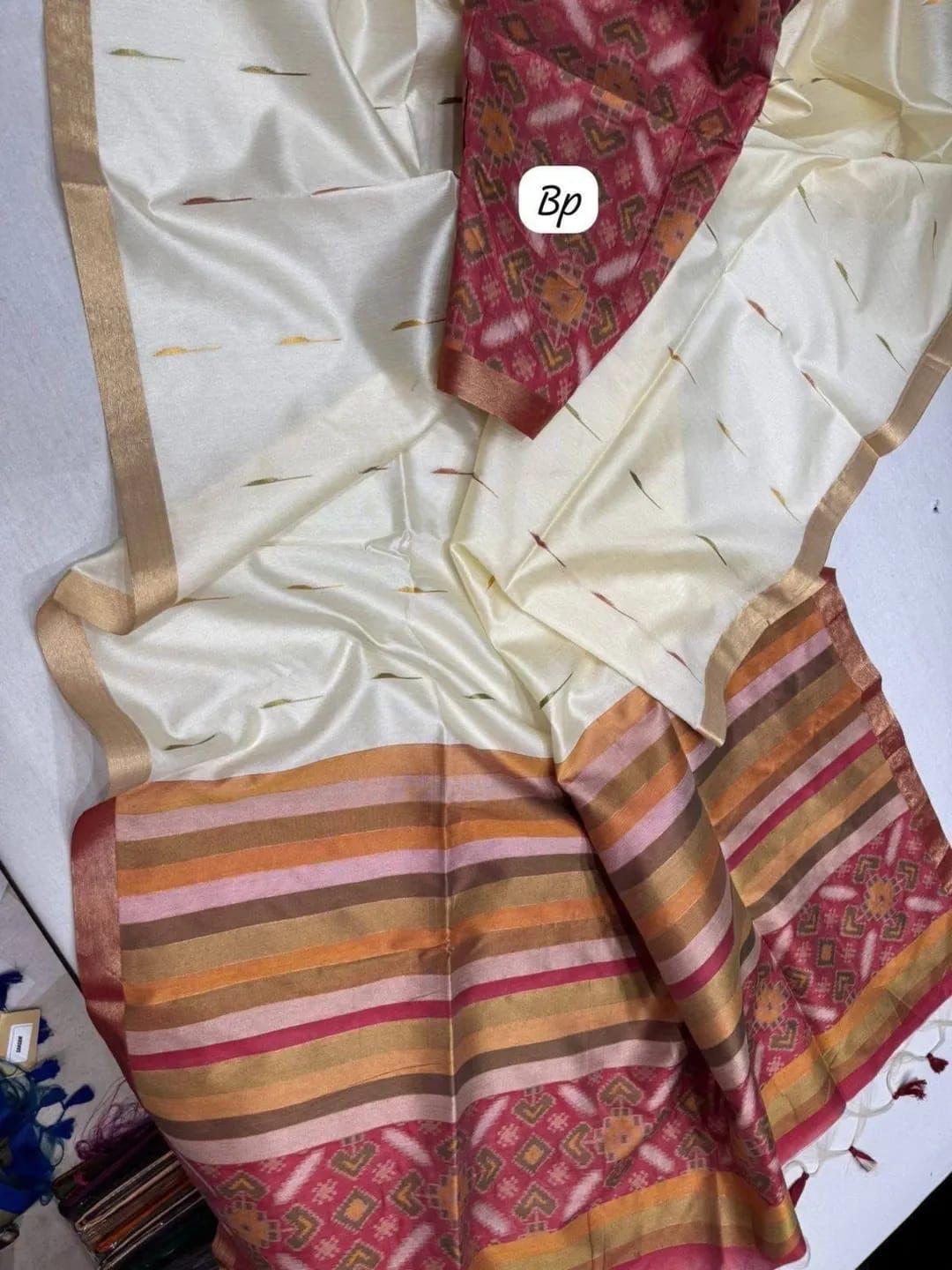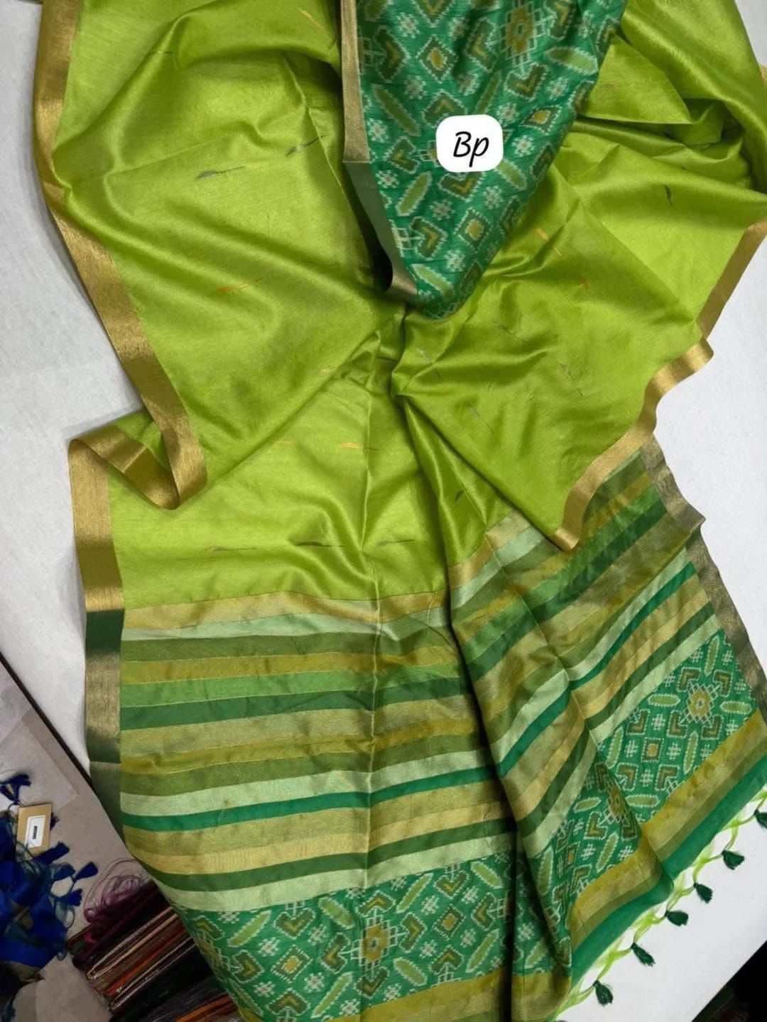 – *Design*: Patola and geometrical stripes in pallu