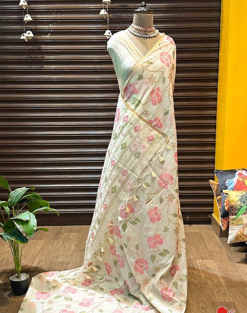 This cotton feel Chanderi fabric gives an authentic Jamdani cotton weave jaal with beautiful colours that compliments with the design.