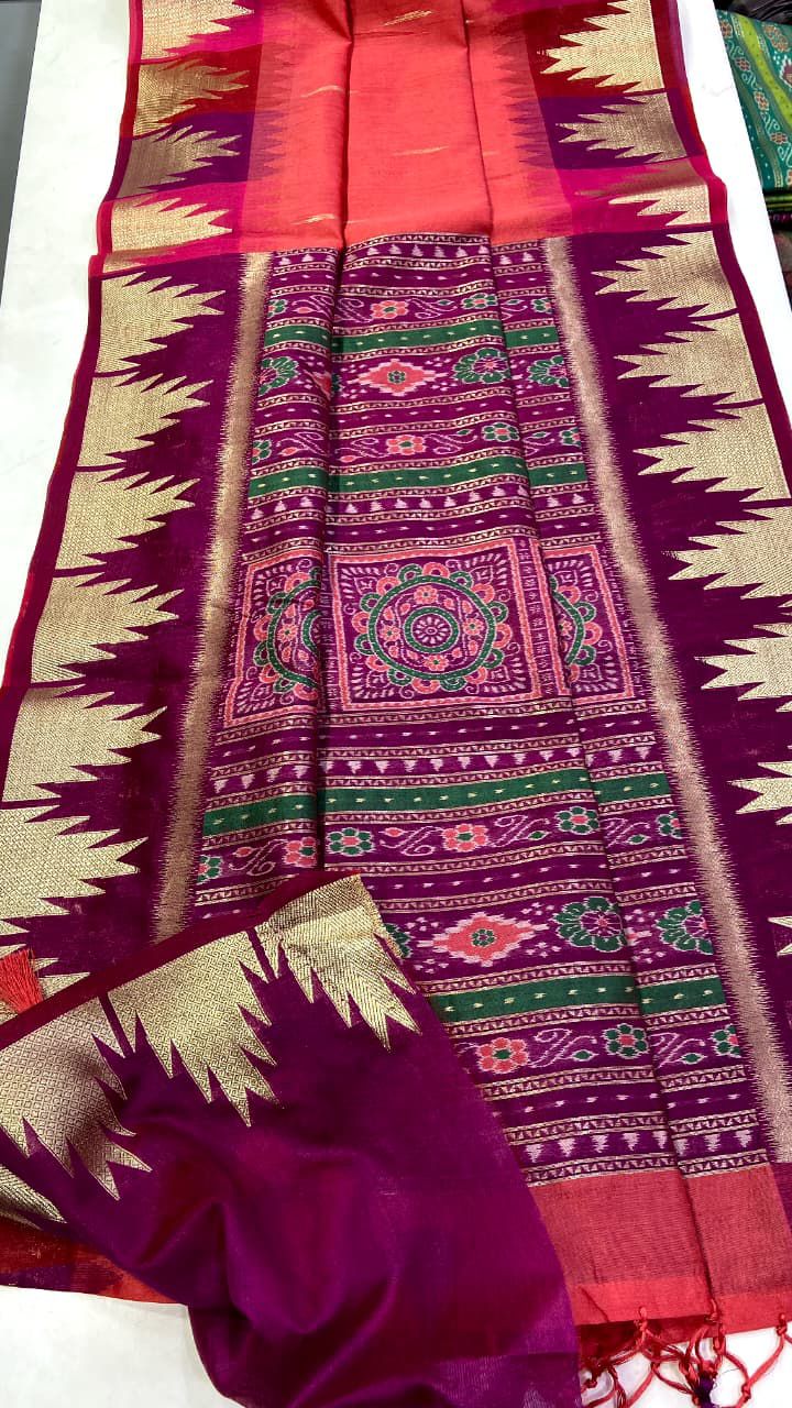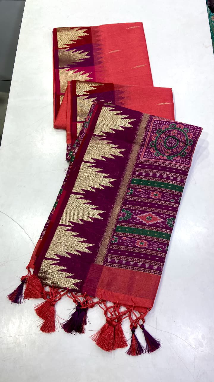 This pure silk feel fabric comes with yet another masterpiece. The weaving temple border on both sides with patola pallu and attached tussels along with running blouse makes this festive product a unique touch.
