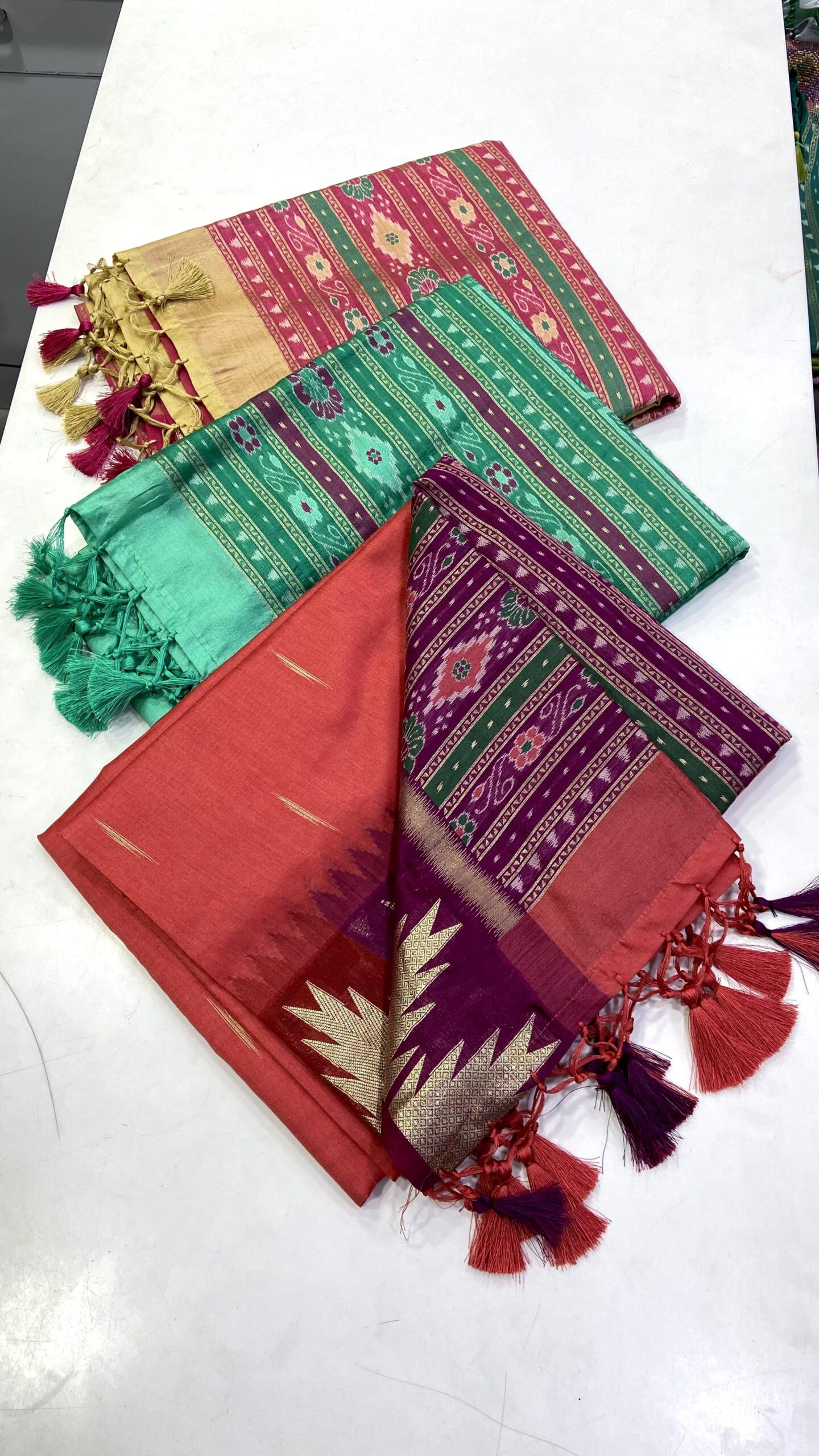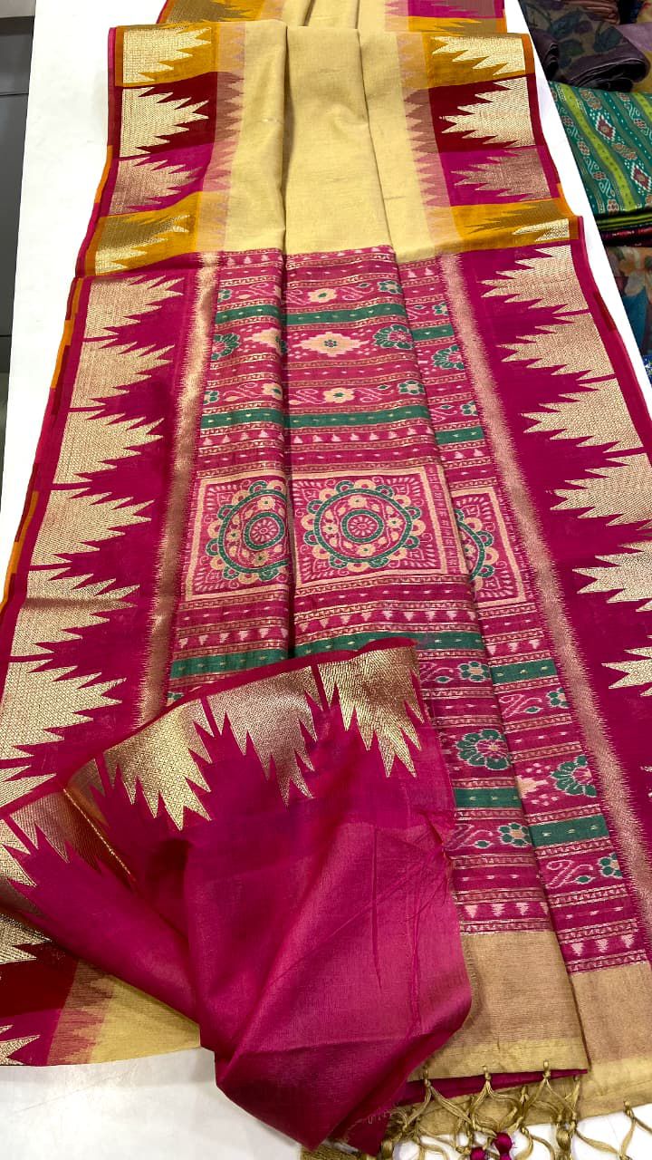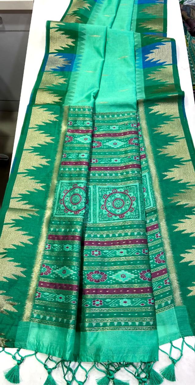 This pure silk feel fabric comes with yet another masterpiece. The weaving temple border on both sides with patola pallu and attached tussels along with running blouse makes this festive product a unique touch.