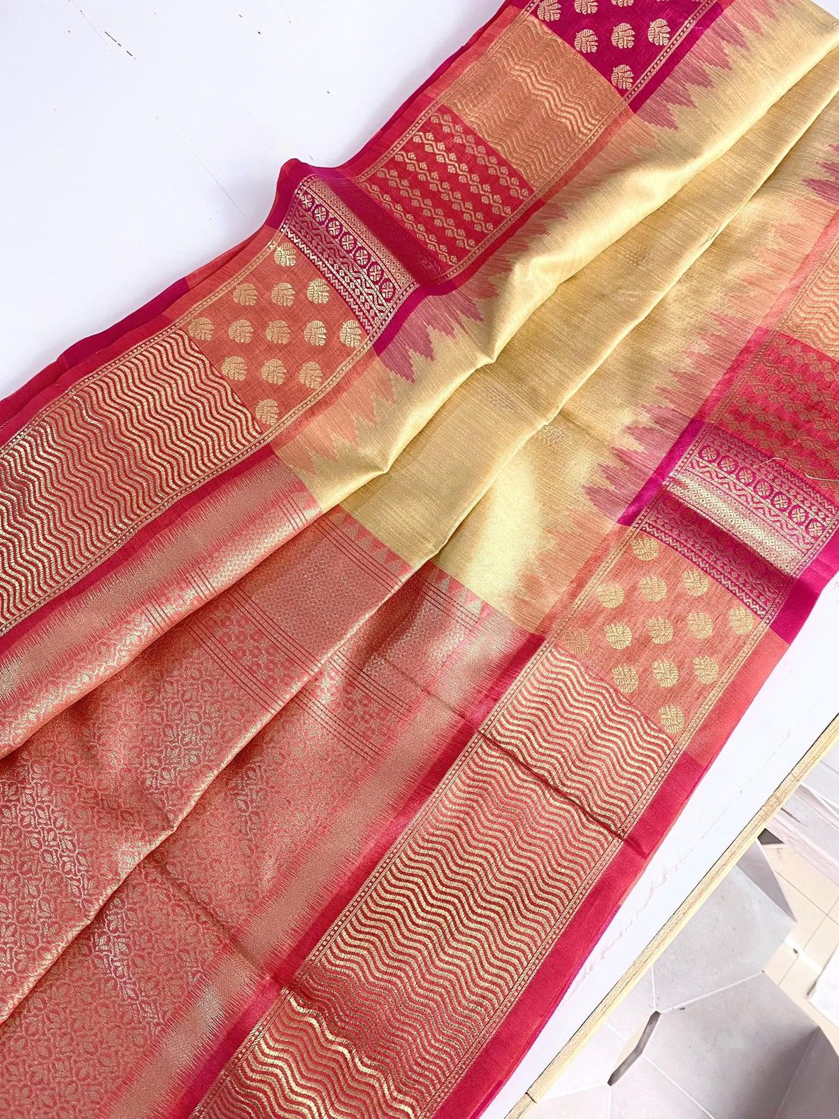 This pure tuscomes with yet another sar silk feel fabric masterpiece. The multi chex along with jari on top makes this festive product a unique touch.